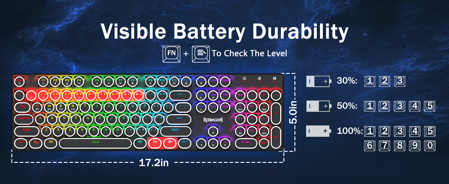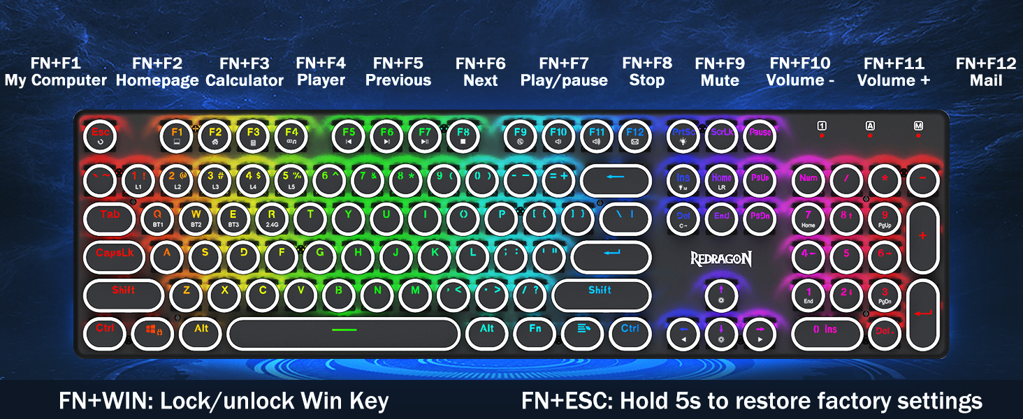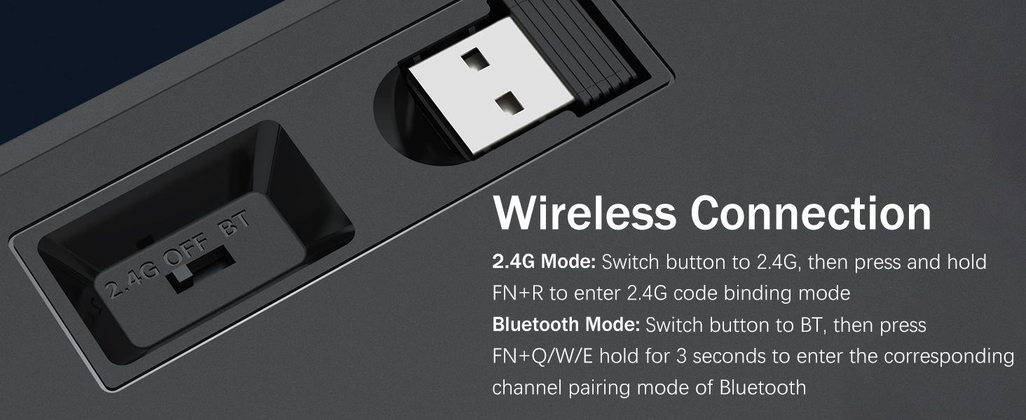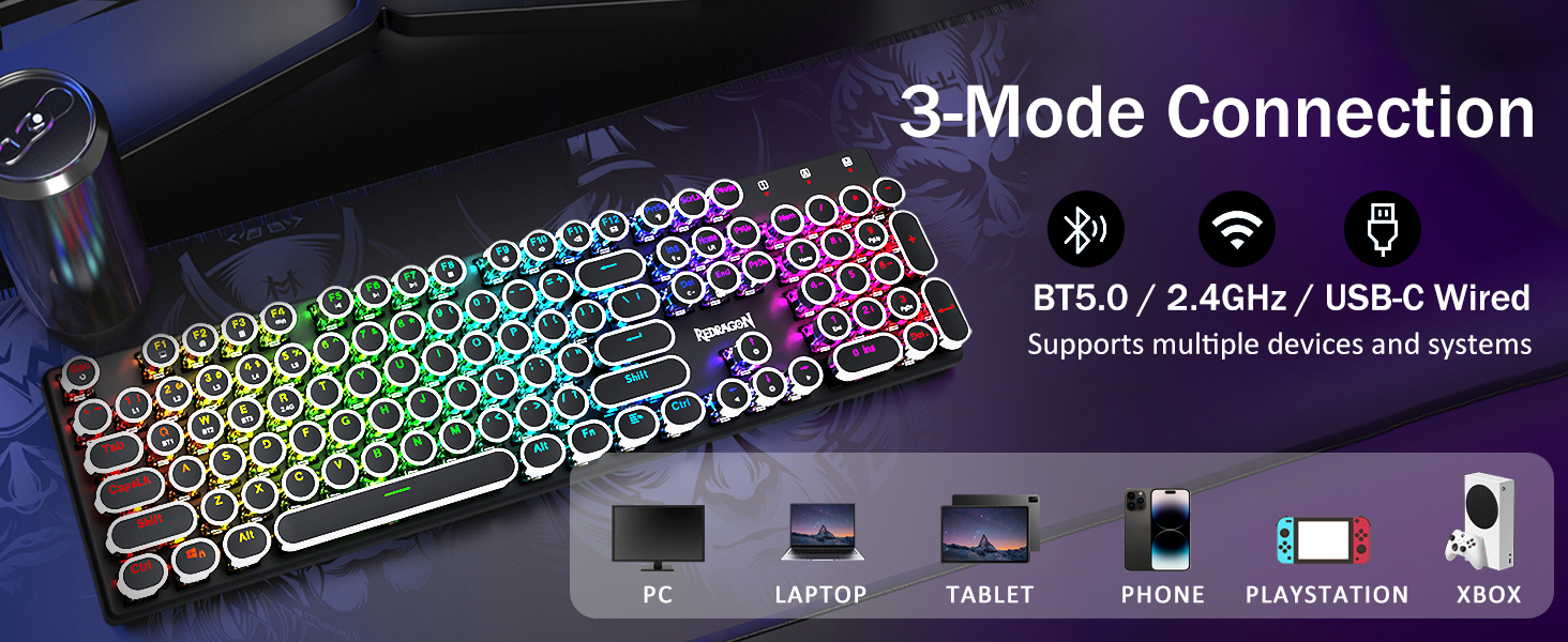 𝟯-𝗠𝗼𝗱𝗲 𝗖𝗼𝗻𝗻𝗲𝗰𝘁𝗶𝗼𝗻 - Geared with Redragon innovative tri-mode connection technology, USB-C wired, Bluetooth 5.0/3.0 & 2.4Ghz wireless modes which make the user experience upgraded to another level in all fields. Press FN+Q/W/E to Bluetooth mode, press FN+R to 2.4G mode.