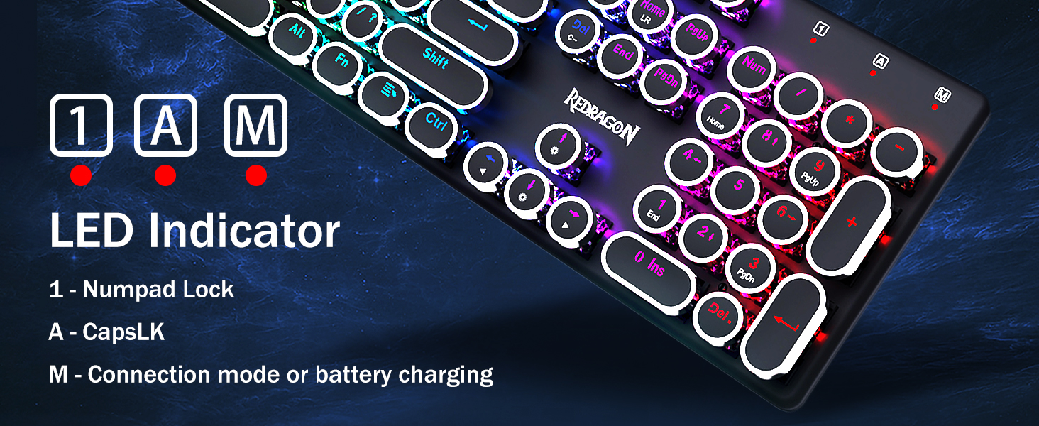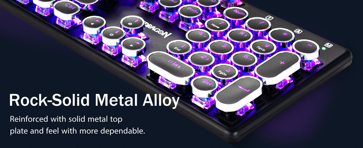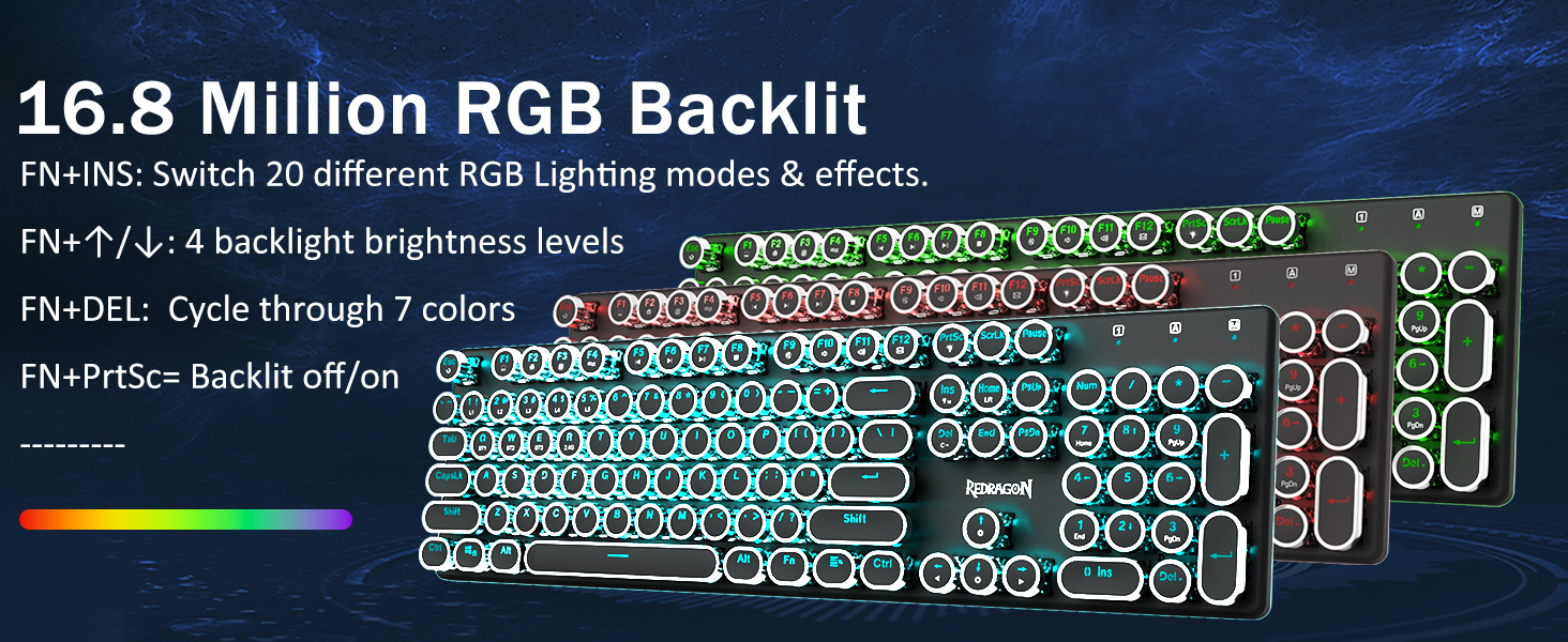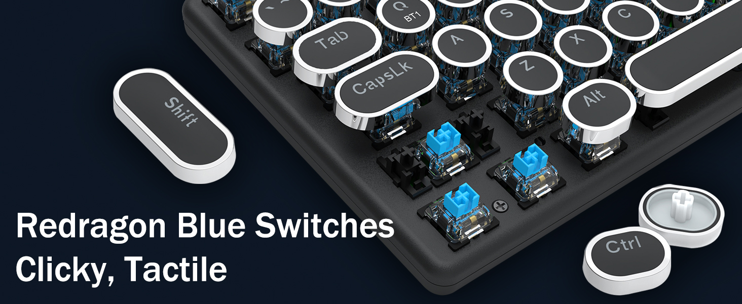 𝗥𝗲𝘁𝗿𝗼 𝗧𝘆𝗽𝗲𝘄𝗿𝗶𝘁𝗲𝗿 𝗦𝘁𝘆𝗹𝗲 𝘄𝗶𝘁𝗵 𝗠𝗲𝗰𝗵𝗮𝗻𝗶𝗰𝗮𝗹 𝗞𝗲𝘆𝘀 - Redragon Mechanical blue switches offer medium resistance, audible click clacky sound & tactile feedback, provides responsive and precise gaming environment and performance. Vintage steampunk keyboard round keycaps looks like a classical typewriter, brings you comfortable typing feeling & stable clicking touch.