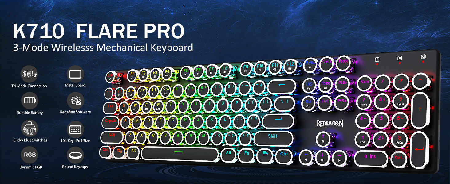 𝗗𝗲𝗽𝗲𝗻𝗱𝗮𝗯𝗹𝗲 𝗠𝗲𝘁𝗮𝗹 𝗣𝗮𝗻𝗲𝗹 & 𝟭𝟬𝟰 𝗞𝗲𝘆𝘀 𝗔𝗻𝘁𝗶 𝗚𝗵𝗼𝘀𝘁𝗶𝗻𝗴 - Upgraded FLARE PRO version keeps using the same tank-solid metal material. Keep the keyboard steady and elegant on the desk, for a premium typing experience. The K710 keyboard support 104-key anti-ghosting technology, allows multiple keys to be pressed at the same time without conflict.