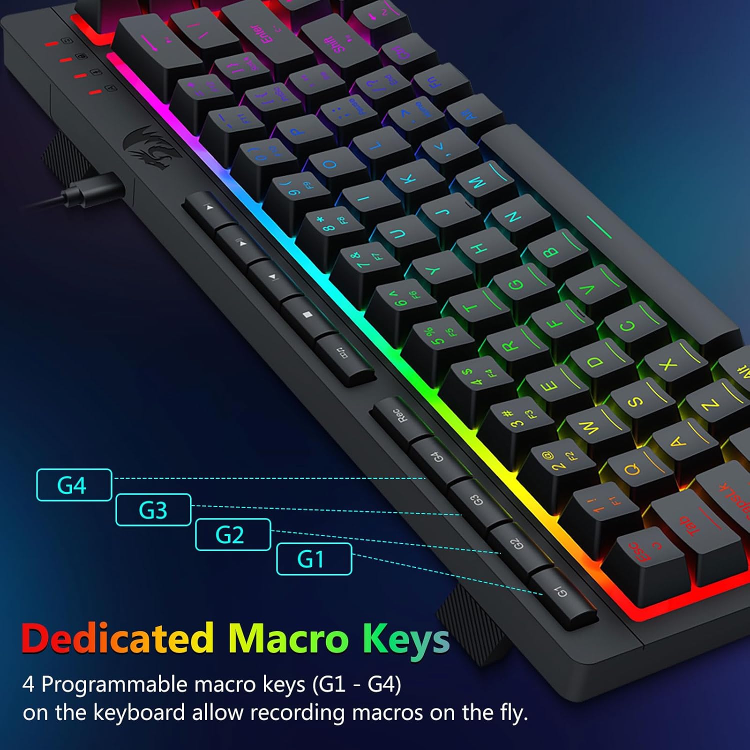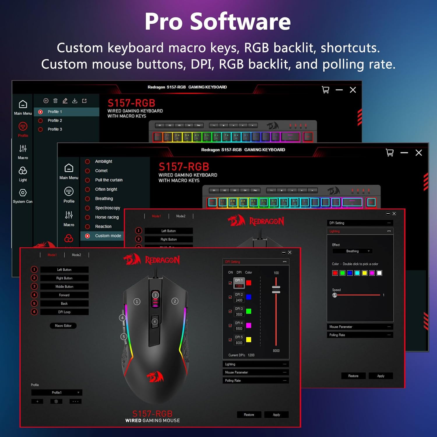 The Redragon Black S157 RGB Backlit Wired Gaming Keyboard and Mouse Combo, manufactured by Chuangquan, is built to elevate your gaming setup with robust features. The keyboard includes 7 different RGB lighting modes and effects, 4 backlight brightness levels, and an adjustable breathing speed to match your style. It is ergonomically designed with an integrated wrist rest for comfort during long sessions and offers 25 conflict-free (n-Key Rollover) keys for precise input. Additionally, it's built to withstand average liquid spills, enhancing its durability. The keyboard also features 10 dedicated multimedia keys plus 12 additional FN+ multimedia keys, providing quick access to various functions .