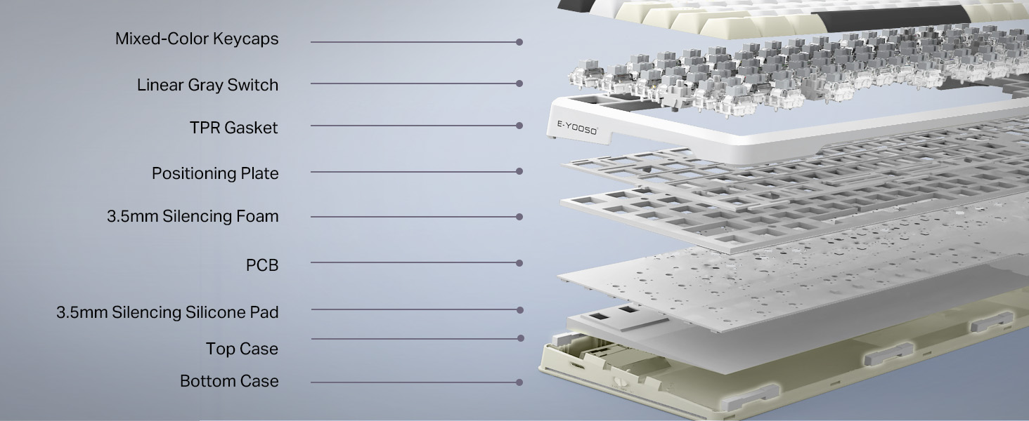 Gasket Mount has recently dominated the scene by suspending internal components via gaskets structure, eliminating hard-mounted connections. Combined with multi-layer acoustic foams, it delivers a signature "bouncy" feel and creamy sound signatures, redefining premium customization standards.