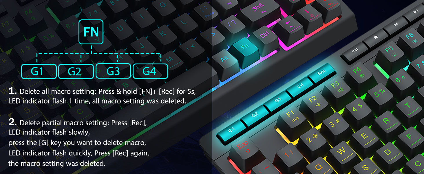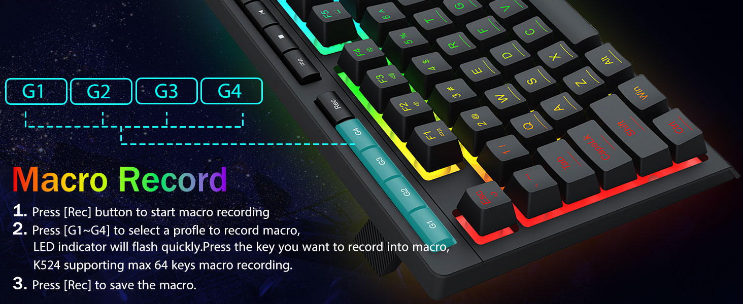 4 Onboard Macro Keys - 4 onboard macro keys (G1~G4) are programmable and work on the fly without any additional software. The keys are easy to edit and can perform a variety of different macros.