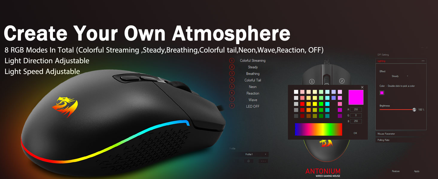 8 Decent RGB Backlit Modes - Turn the backlit on and make some kills in your gaming battlefield. The hyped dynamic RGB backlit vibe will never let you down when decorating your gaming space, it would be better with other Redragon accessories with lights on.