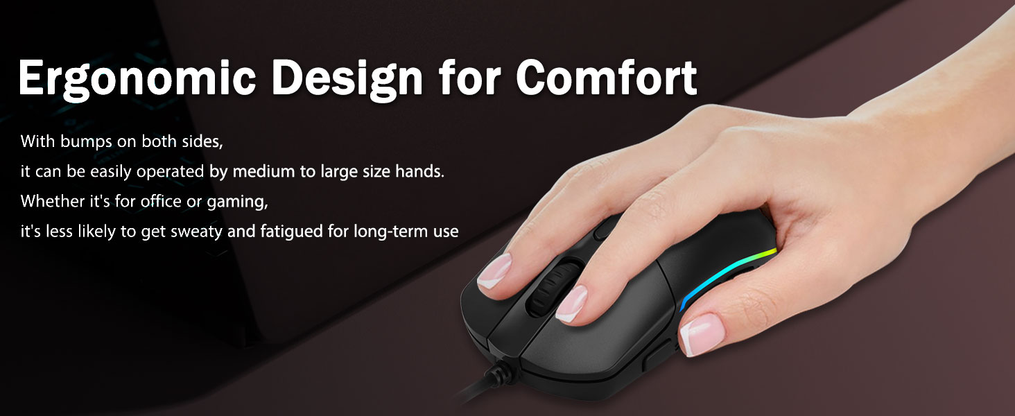 Comfort Grip - The ergonomic bumps on both sides makes gaming mice fit in any hands. It provides long-lasting comfort for players, without fatigue even during long hours of intense gameplay. It won’t slip when lifting the gaming mouse, or making fast and precise swipes.