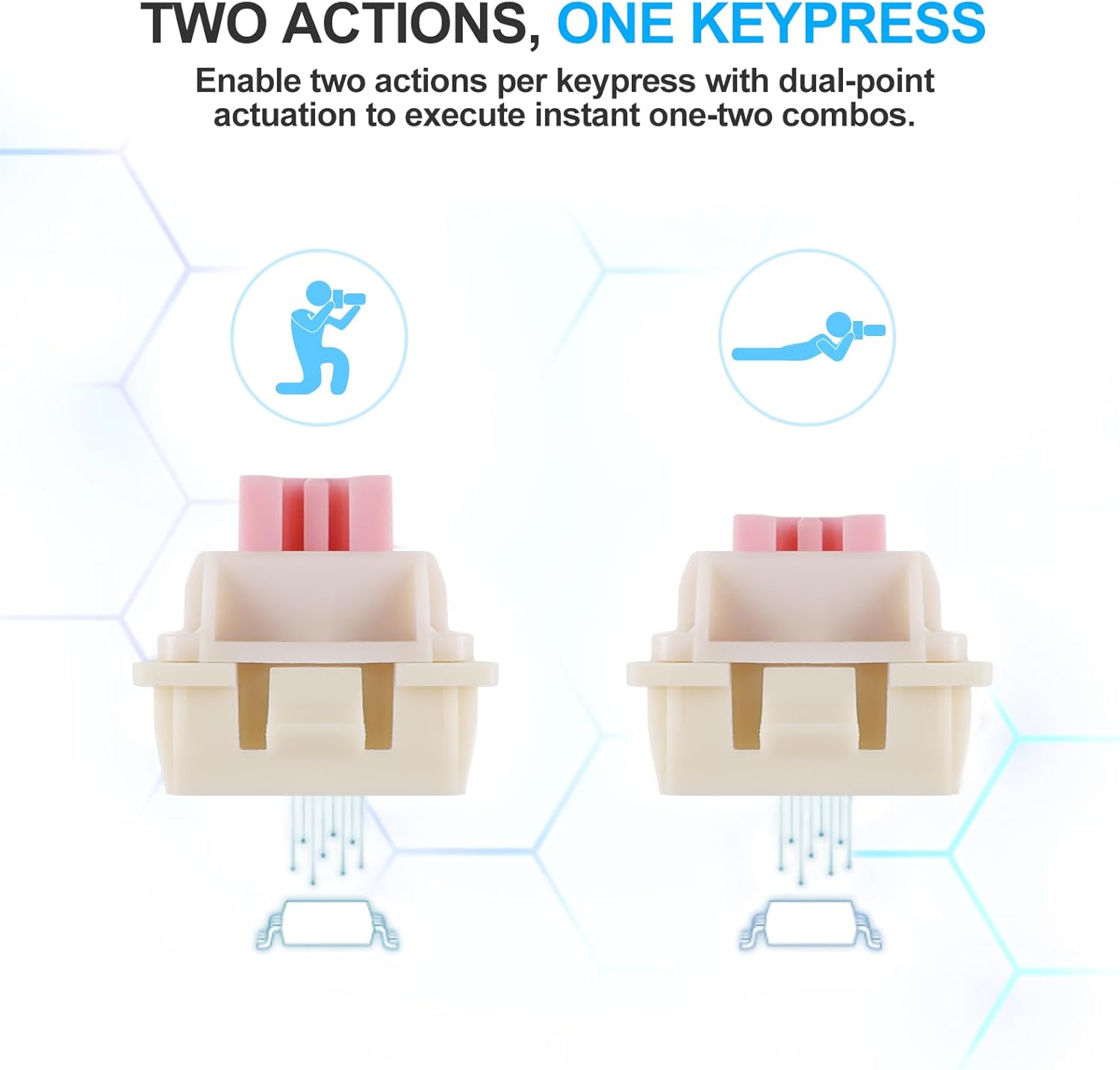 Two Actions for One Keypress: Dual-point actuation lets you assign two discrete actions to one keypress, giving you the ability to execute instant one-two combos.