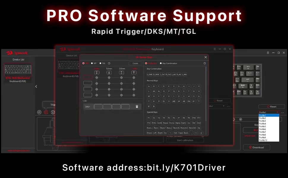 Pro Software Customizable: Expand your options using the Redragon driver to design your own new modes and effects. Macros with different keybindings or shortcuts for more efficient work and gaming. Settinng different switch travel distance to match different use scenes. 𝗛𝗼𝘄 𝘁𝗼 𝗰𝗵𝗮𝗻𝗴𝗲 𝗮 𝗱𝗶𝗳𝗳𝗲𝗿𝗻𝘁 𝗽𝗿𝗼𝗳𝗶𝗹𝗲:need to click Download button after you choose a different profile. Software link: bit.ly/K701Driver