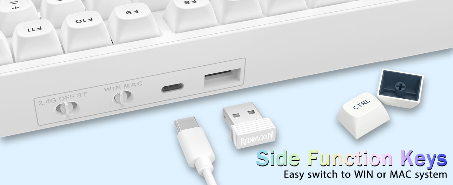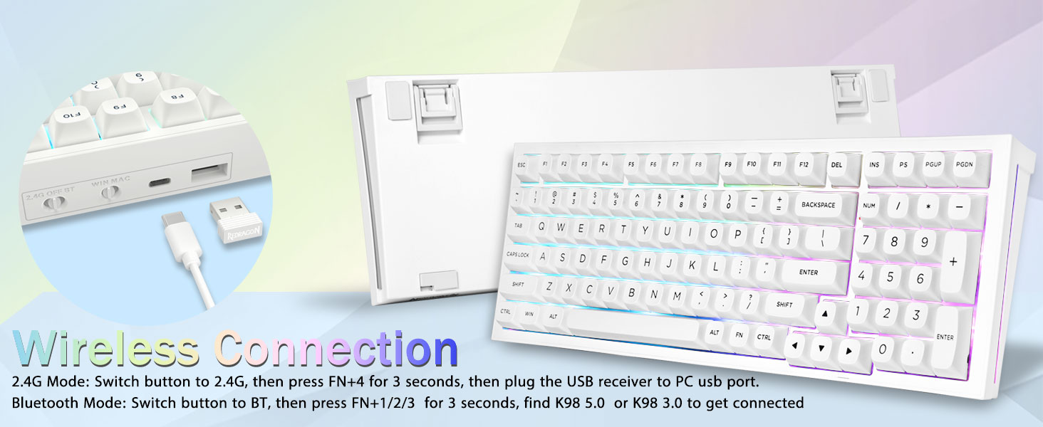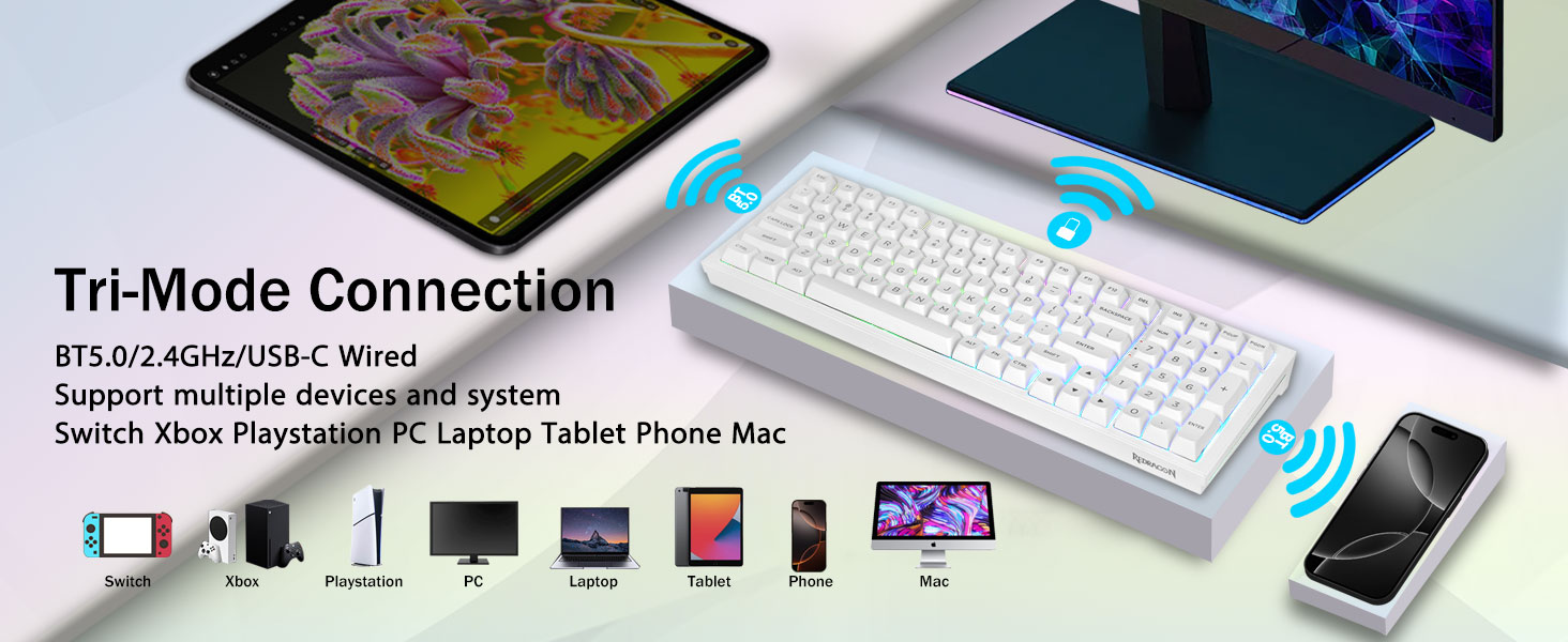 Multi-Device Connection: Redragon K723 wireless mechanical keyboard provides three connection methods, including BT5.0, 2.4GHz wireless mode, and USB wired mode. It can be connected to up to five devices at the same time, and switch between them easily by FN and key combination keys. No limits about your keyboard connection to meet the needs of work, gaming, and study.