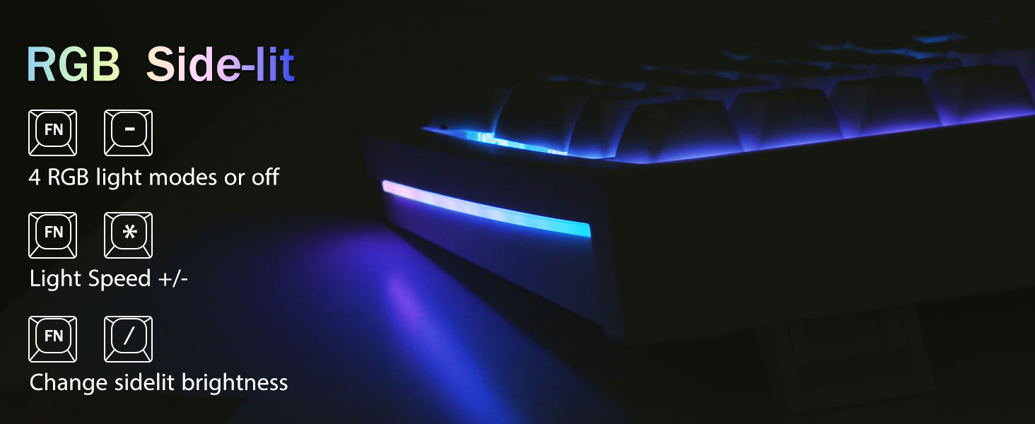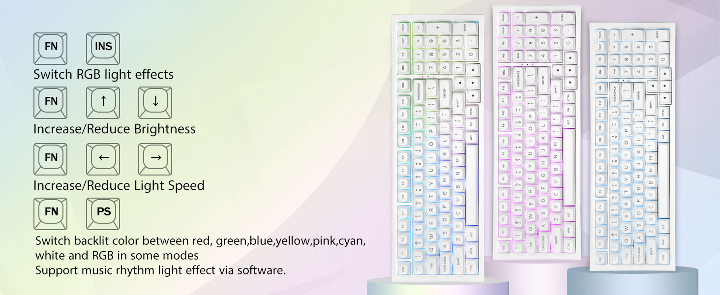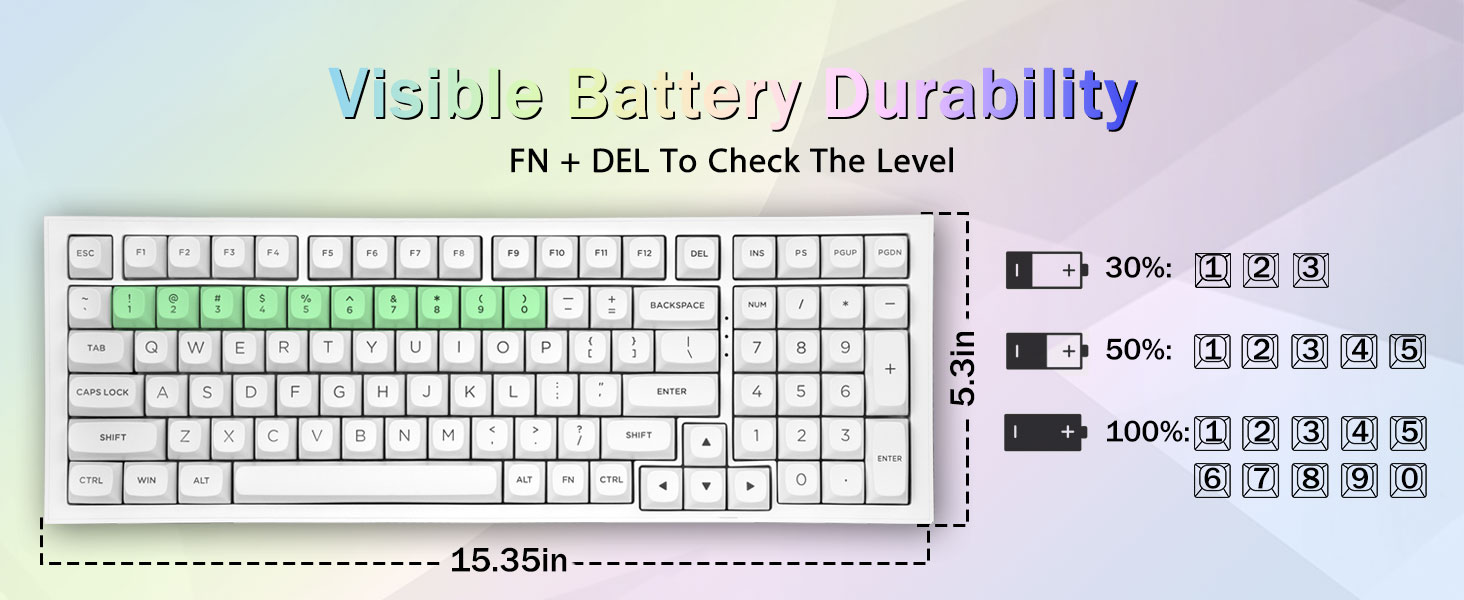 PBT Keycaps and 4000mAh Battery: 99 keys 96% layout compact keyboard can save more desktop space while keep necessary arrow keys and number area for games and work. The rechargeable keyboard built-in 4000mAh large capcacity battery to provide more power and longer battery life. Double shot PBT keycaps, made from two colors material molded into each others, make the keycaps characters maintain the vibrance and saturation, clear and not fade.