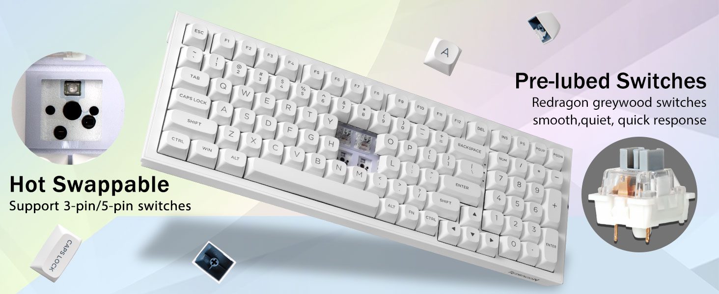 Hot-swappable Custom Keyboard: The switches and keycaps can be freely replaced(keycap/switch puller are included in the package).This customizable keyboard with hot-swap PCB allows users to replace 3 pins/5 pins switches easily without soldering issue. K723 mechanical keyboards equipped with pre-lubed linear switches, bring smooth typing feeling and pleasant typing sound, provide fast response for exciting game