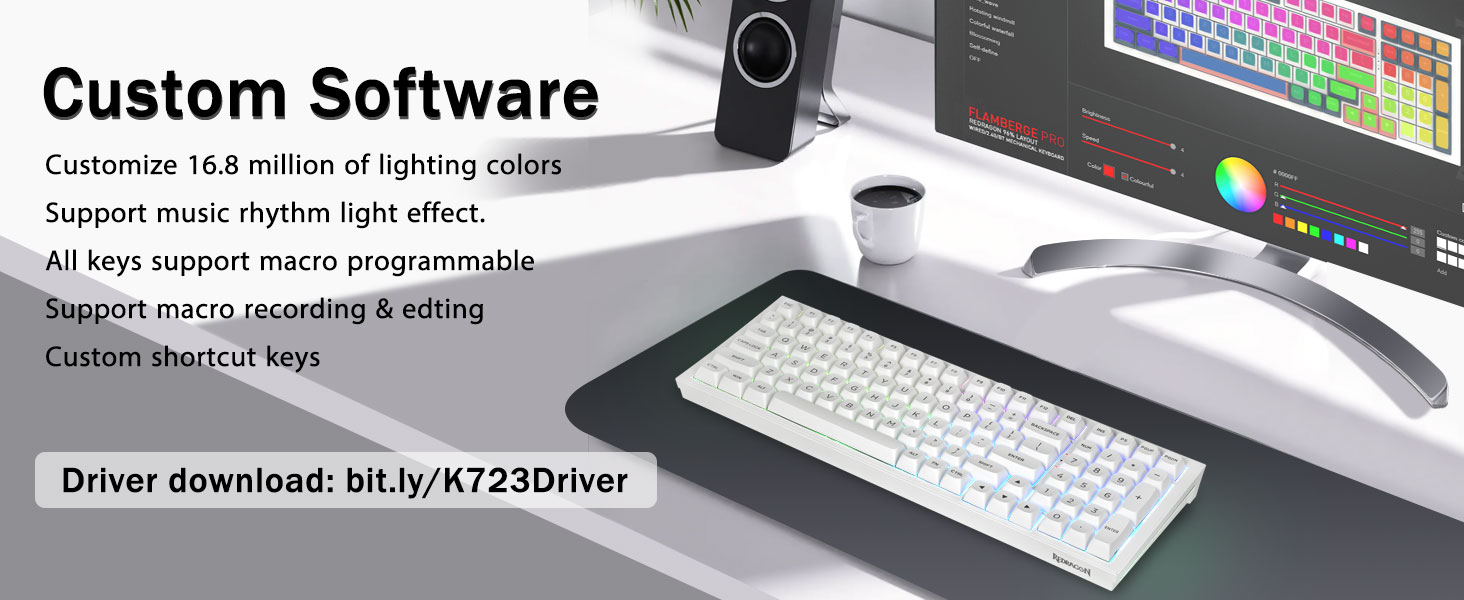 Mechanical Gaming Keyboard: K723 is a premium mechanical keyboard for both work and game. With 16 RGB lighting effect to adds a great atmosphere to the game room. Keys support macro customization, which allows macro recording and editing, customize key function and 16.8 million light colors, and supports cool music rhythm lighting effects with driver. N-key rollover, keyboard can respond to multiple key presses at the same time, which is helpful in very exciting real-time games.