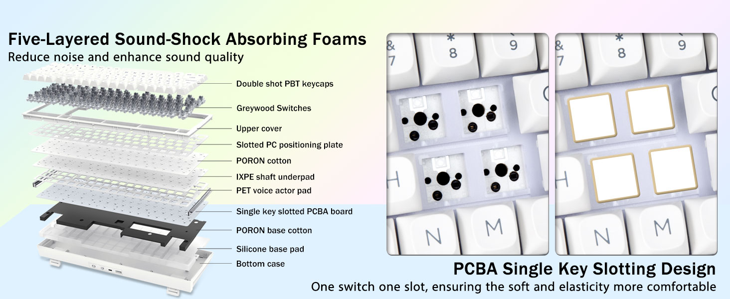 Gasket Structure and PCB Single Key Slotting: This computer keyboard features a gasket structure, extended integrated silicone pad, and PCB single key slotting, better optimizes resilience and stability, making the hand feel softer and more elastic. Five layers of filling silencer fills the gap between the PCB, the positioning plate and the shaft,effectively counteracting the cavity noise sound of the shaft hitting the positioning plate, and providing a solid feel.