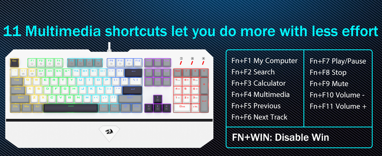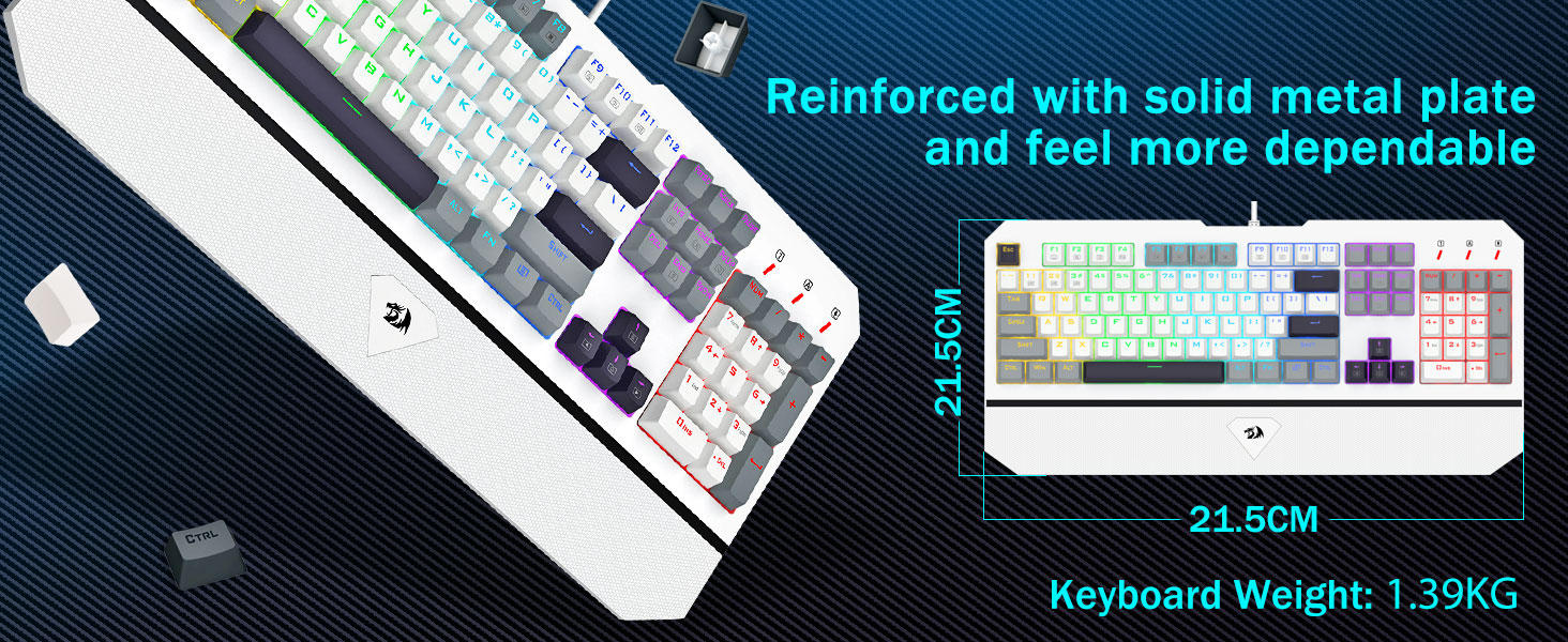 Chuangquan, a leading Chinese manufacturer, supplies the Redragon White K558 Mechanical Gaming Wired 104 keys Keyboard, ideal for global wholesale partners. This full-size keyboard is built with mechanical blue switches, offering a tactile clicky response and a lifespan of over 50 million keystrokes. The RGB backlighting with multiple modes enhances visibility in low-light environments, while 100% anti-ghosting ensures all keystrokes are registered accurately during intense gaming sessions. Eleven dedicated multimedia shortcuts provide quick control over audio and media playback. Designed for durability and performance, this keyboard is a top choice for suppliers seeking high-quality, competitively priced gaming peripherals. The Chuangquan factory supports OEM/ODM services, offering reliable customization for bulk orders with assured quality control.