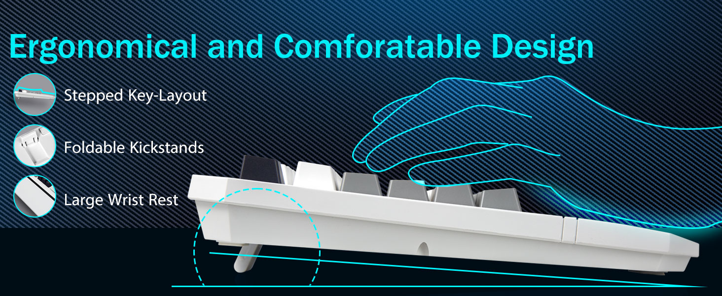 【Advanced Ergonomics for All-Day Comfort】 Designed with your comfort in mind, our PC gamer keyboard features a scientific stair - up keycap layout and a spacious wrist rest. This setup keeps your arms in a natural position, reducing hand fatigue during extended use. The wired keyboard also comes with 2 sturdy, foldable rear kickstands, allowing you to adjust the slope for optimal posture.