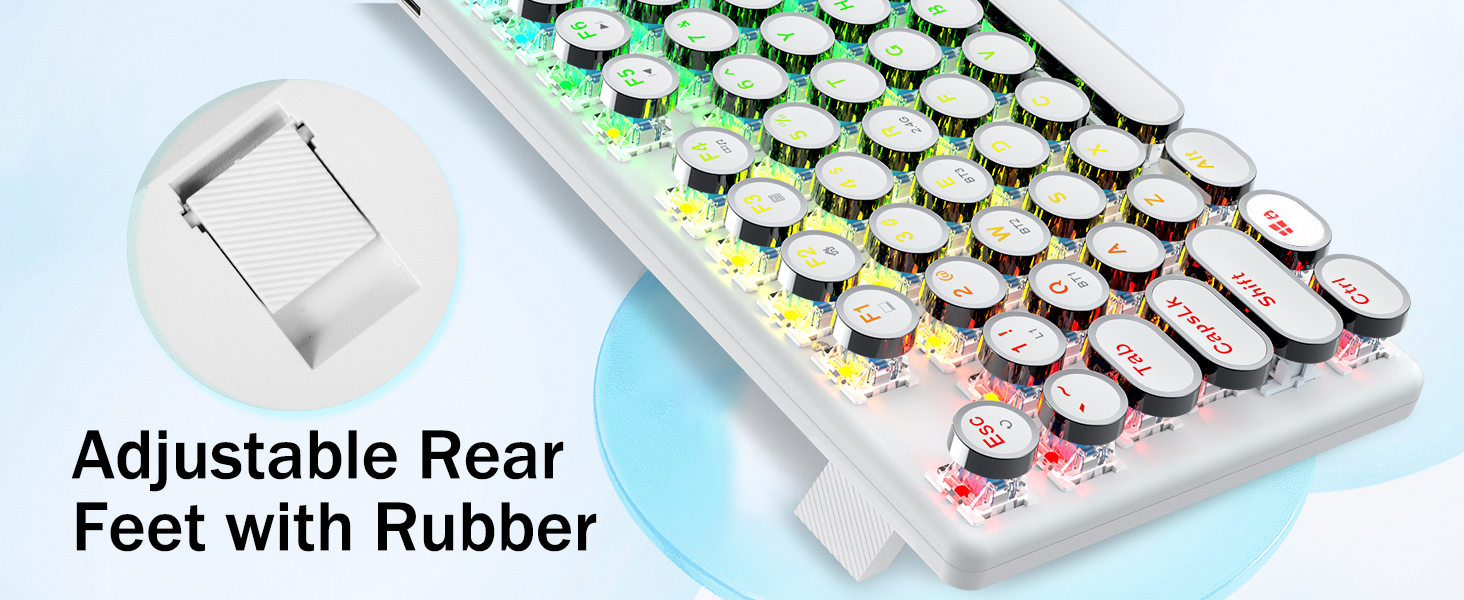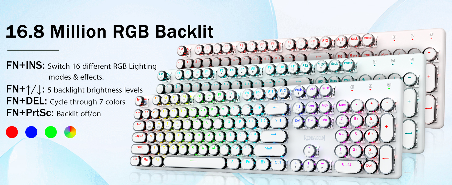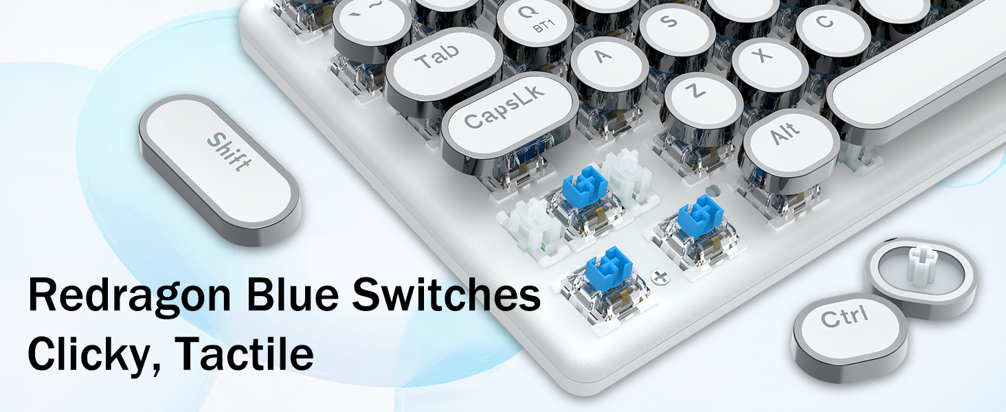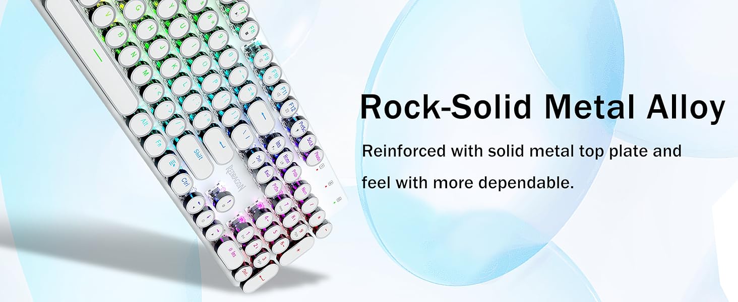 𝗥𝗲𝘁𝗿𝗼 𝗧𝘆𝗽𝗲𝘄𝗿𝗶𝘁𝗲𝗿 𝗦𝘁𝘆𝗹𝗲 𝘄𝗶𝘁𝗵 𝗠𝗲𝗰𝗵𝗮𝗻𝗶𝗰𝗮𝗹 𝗞𝗲𝘆𝘀 - Redragon Mechanical blue switches offer medium resistance, audible click sound & tactile feedback, provides responsive and precise gaming environment and performance. Vintage steampunk keyboard round keycaps looks like a classical typewriter, brings you comfortable typing feeling & stable clicking touch.