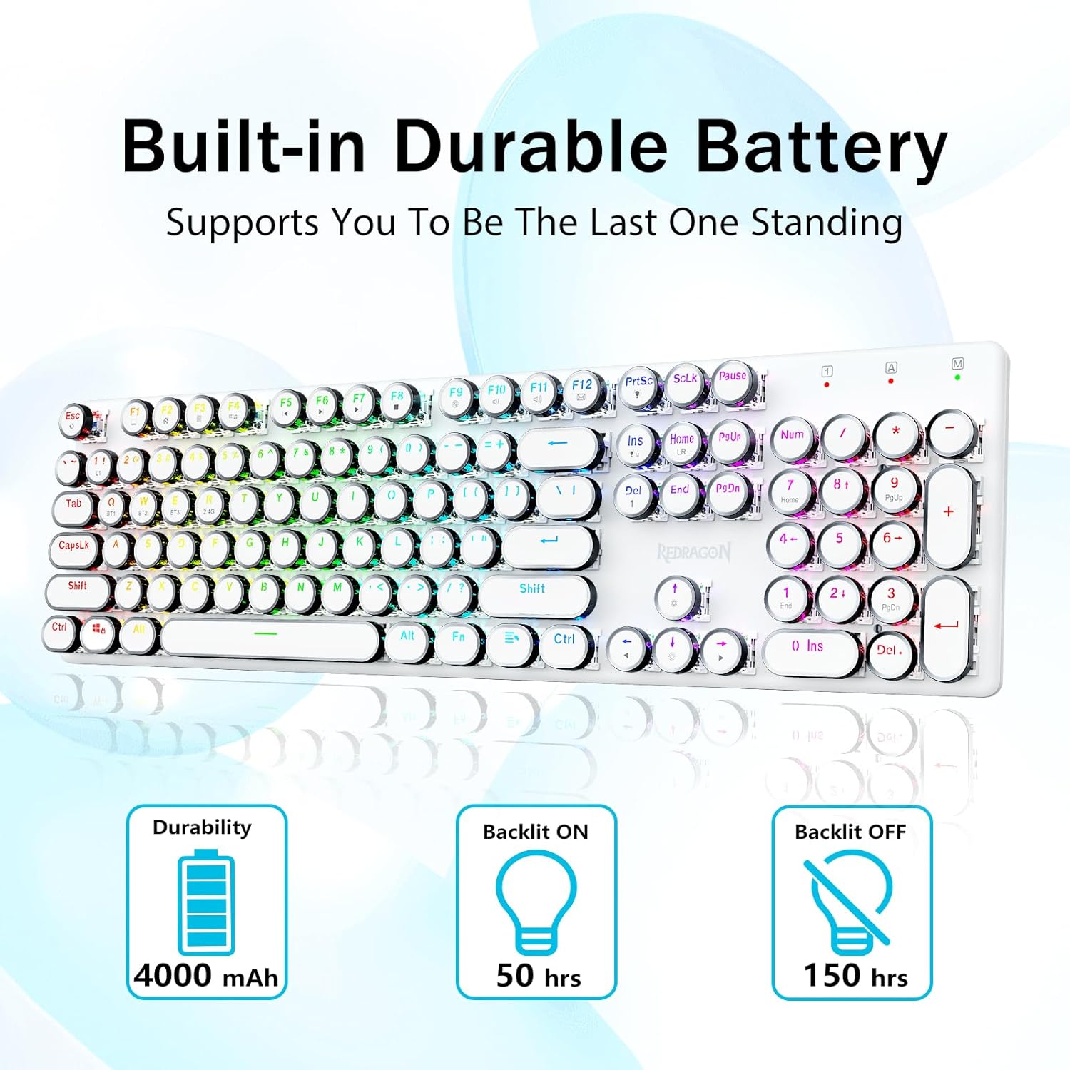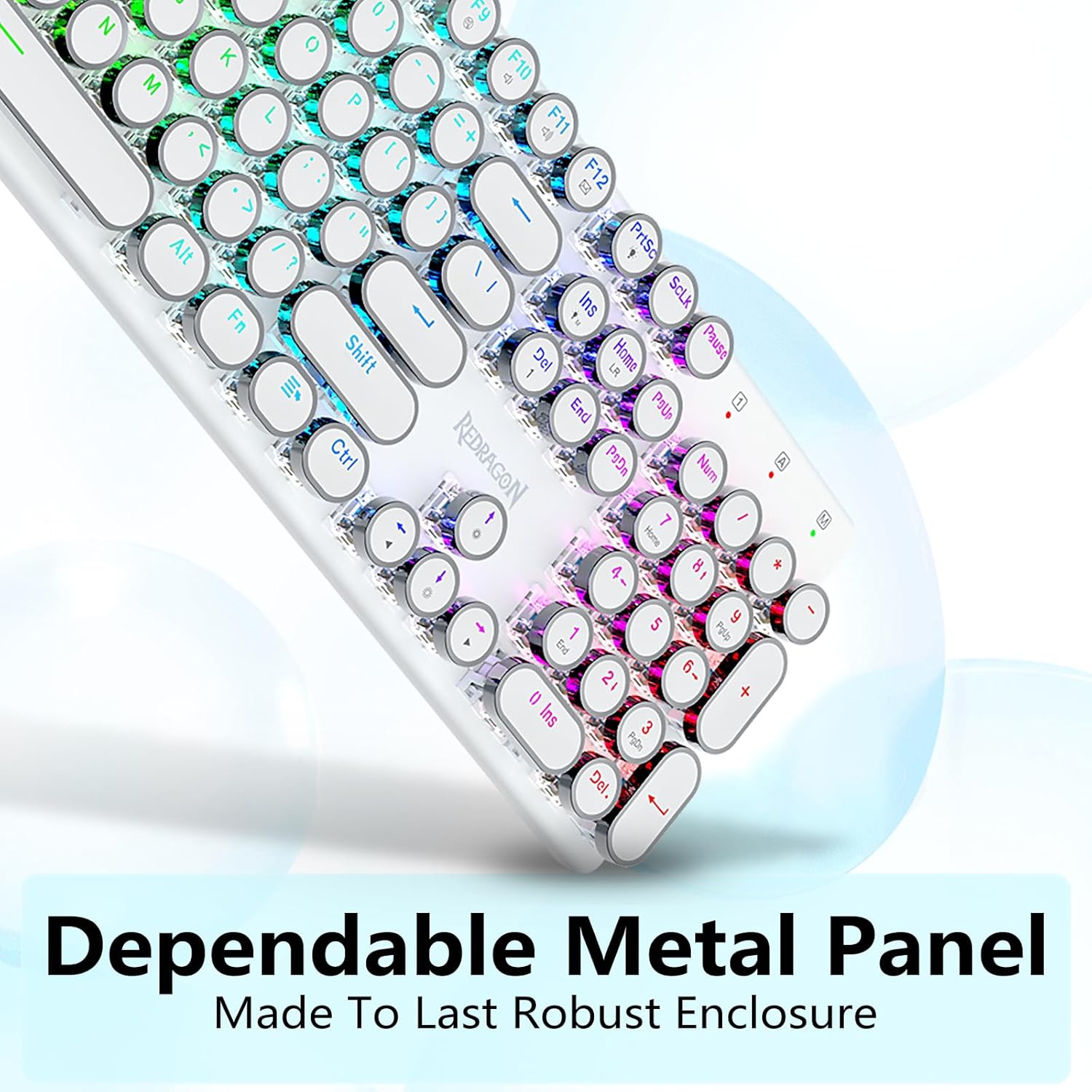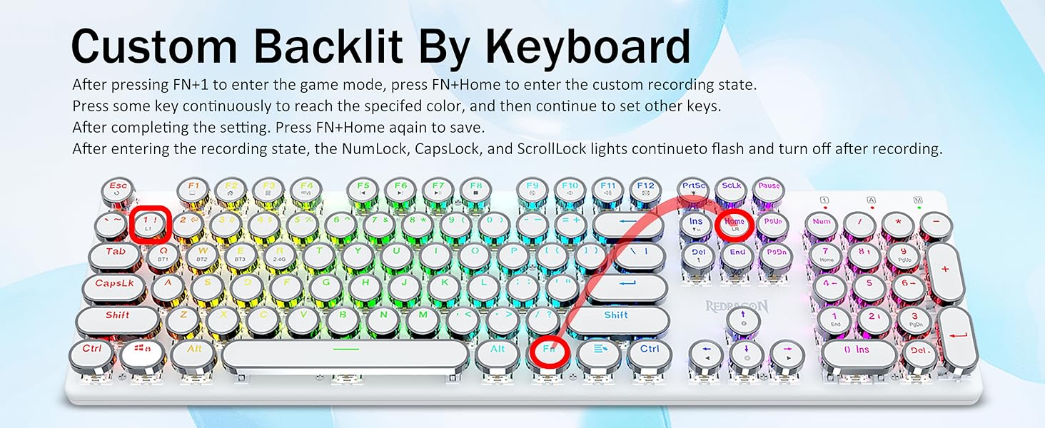 𝗥𝗲𝘁𝗿𝗼 𝗧𝘆𝗽𝗲𝘄𝗿𝗶𝘁𝗲𝗿 𝗦𝘁𝘆𝗹𝗲 𝘄𝗶𝘁𝗵 𝗠𝗲𝗰𝗵𝗮𝗻𝗶𝗰𝗮𝗹 𝗞𝗲𝘆𝘀 - Redragon Mechanical blue switches offer medium resistance, audible click sound & tactile feedback, provides responsive and precise gaming environment and performance. Vintage steampunk keyboard round keycaps looks like a classical typewriter, brings you comfortable typing feeling & stable clicking touch.