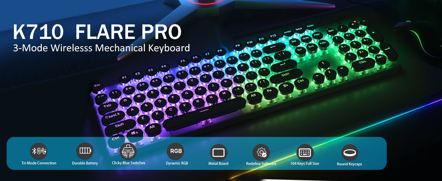 𝗗𝗲𝗽𝗲𝗻𝗱𝗮𝗯𝗹𝗲 𝗠𝗲𝘁𝗮𝗹 𝗣𝗮𝗻𝗲𝗹 & 𝟭𝟬𝟰 𝗞𝗲𝘆𝘀 𝗔𝗻𝘁𝗶 𝗚𝗵𝗼𝘀𝘁𝗶𝗻𝗴 - Upgraded FLARE PRO version keeps using the same tank-solid metal material. Keep the keyboard steady and elegant on the desk, for a premium typing experience. The K710 keyboard support 104-key anti-ghosting technology, allows multiple keys to be pressed at the same time without conflict.