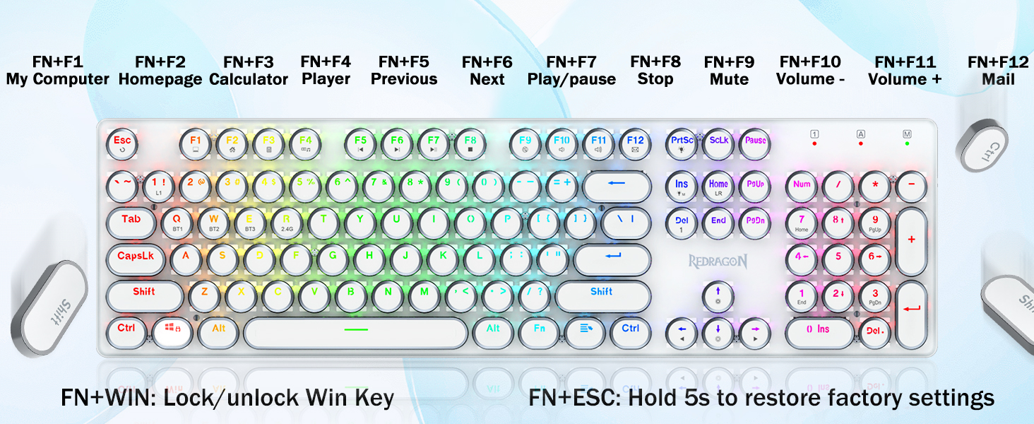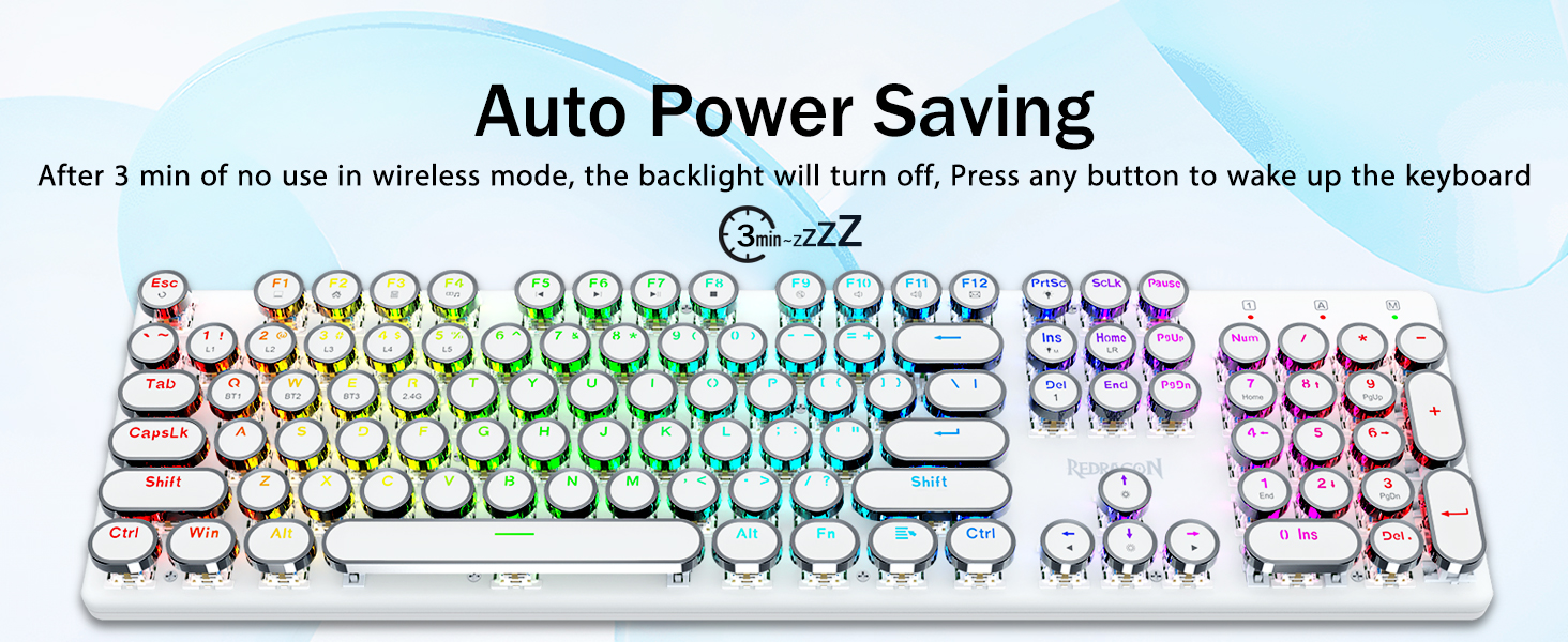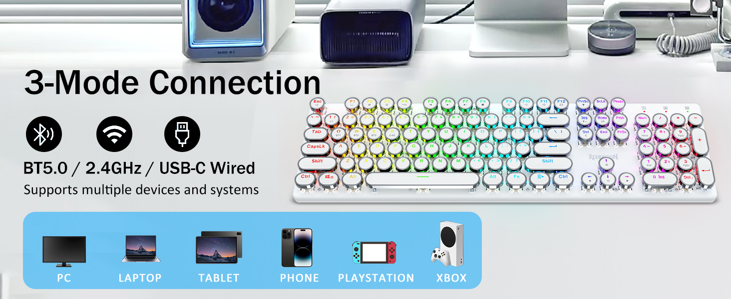 𝟯-𝗠𝗼𝗱𝗲 𝗖𝗼𝗻𝗻𝗲𝗰𝘁𝗶𝗼𝗻 - Geared with Redragon innovative tri-mode connection technology, USB-C wired, Bluetooth 3.0/5.0 & 2.4Ghz wireless modes which make the user experience upgraded to another level in all fields. Press FN+Q/W/E to Bluetooth mode, press FN+R to 2.4G mode.
