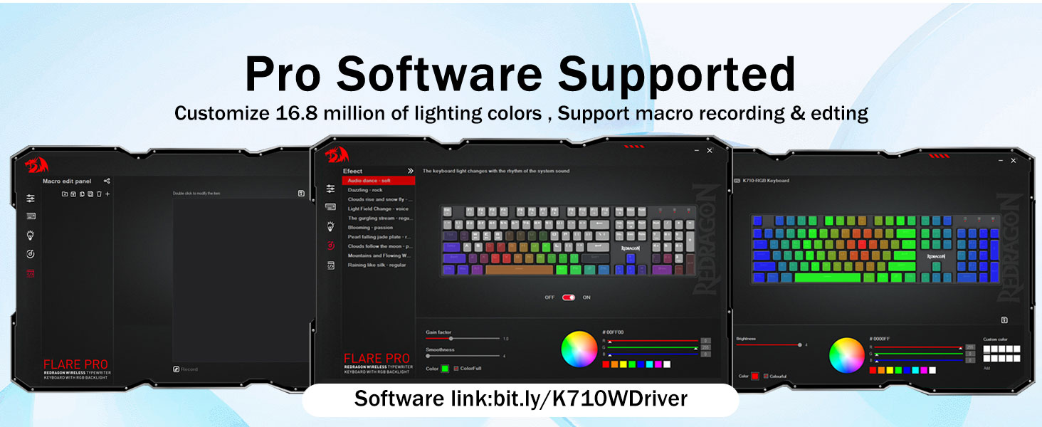 𝗣𝗿𝗼 𝗦𝗼𝗳𝘁𝘄𝗮𝗿𝗲 𝗦𝘂𝗽𝗽𝗼𝗿𝘁𝗲𝗱 - Expand your options using the available software to design your own new modes and effects. Macros with different keybindings or shortcuts for more efficient work and gaming.Software link: bit.ly/K710WDriver.