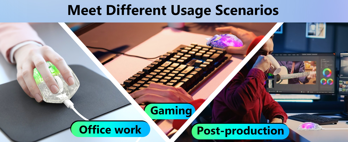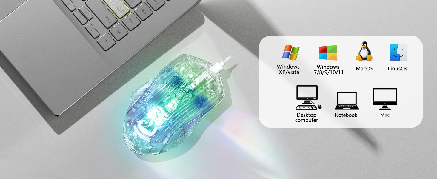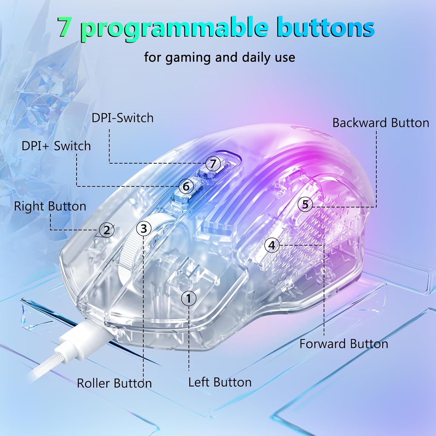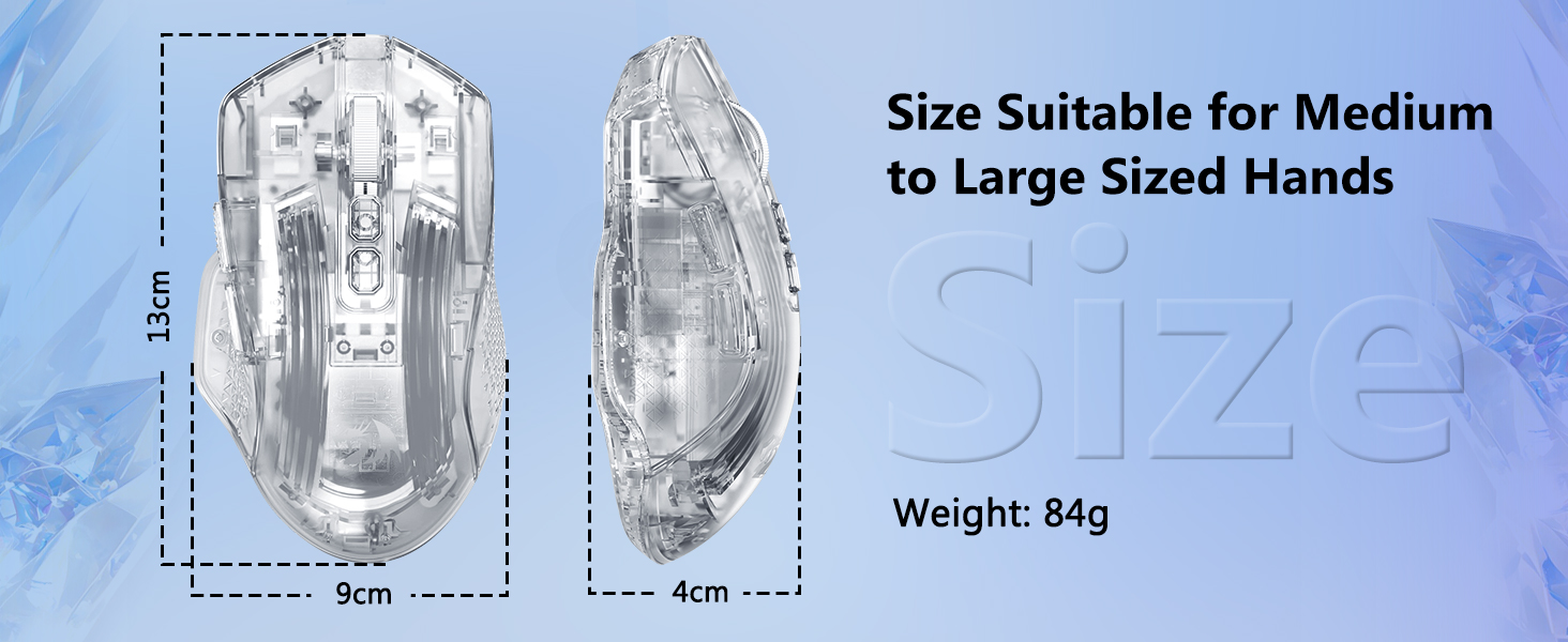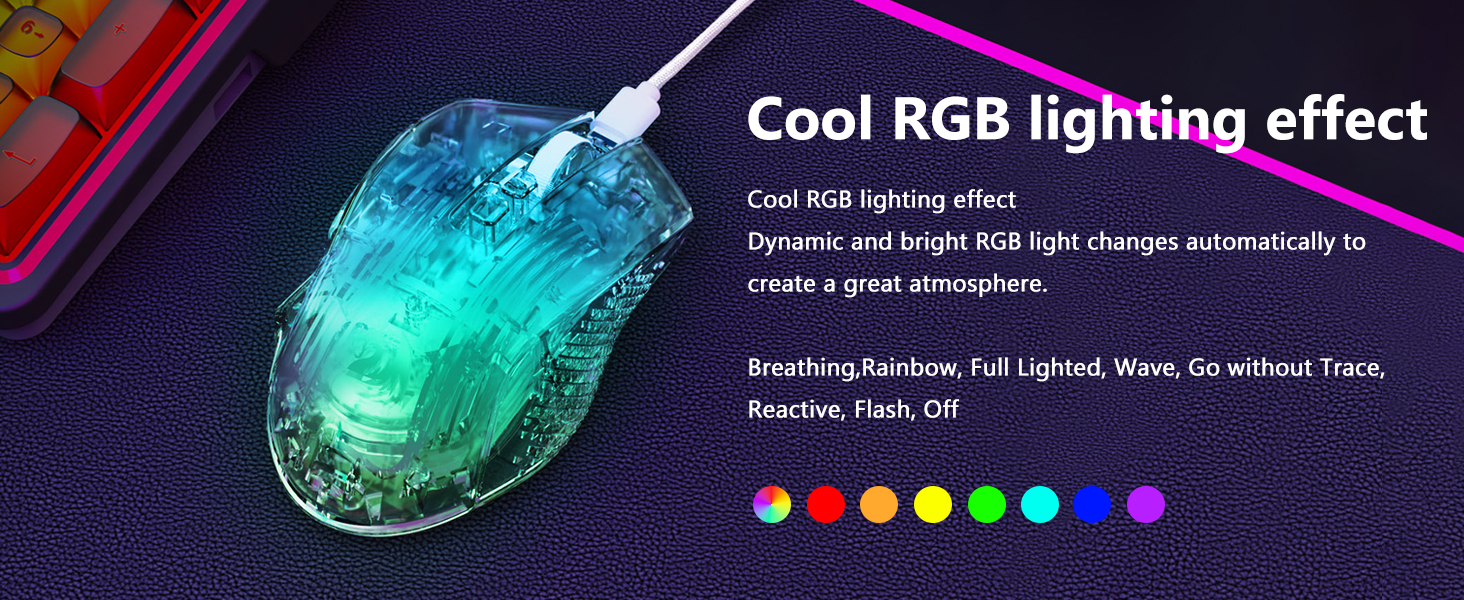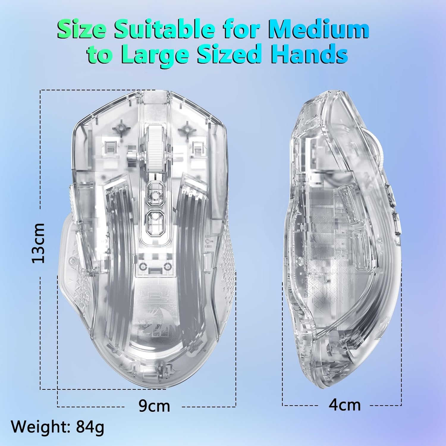 【Transparent Shell and Comfort Grip】The entire body is covered with a fully transparent PC shell,giving you a wonderful feeling of future technology. The ergonomic bumps on both sides makes gaming mice fit in any hands. It provides long-lasting comfort for players, without fatigue even during long hours of intense gameplay. It won’t slip when lifting the gaming mouse, or making fast and precise swipes.
